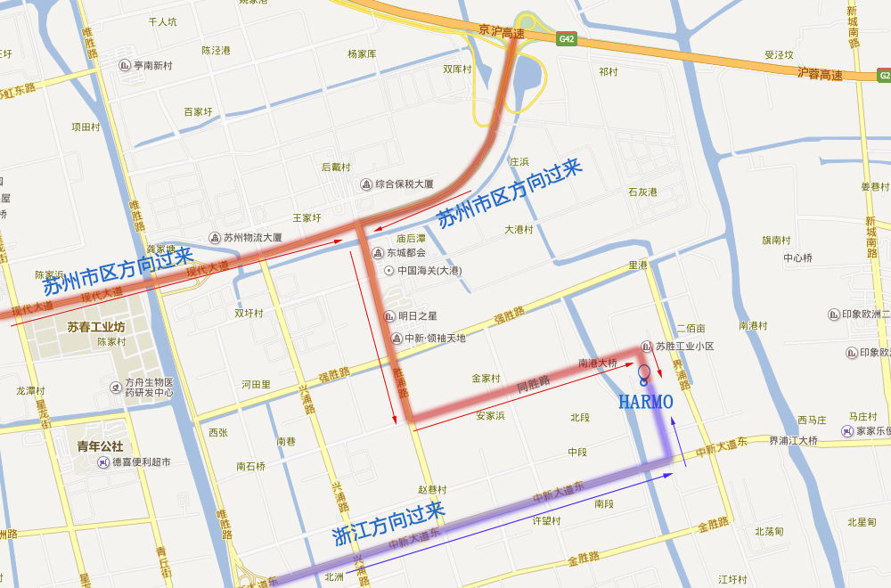 3,浙江方向過來:蘇嘉杭走到蘇州繞城朝蘇通大橋方向——〉吳淞江工業(yè)園區(qū)出口下——〉直走第一個(gè)路口右轉(zhuǎn)——〉直走第一個(gè)紅綠燈右轉(zhuǎn)——〉直走第二個(gè)紅綠燈右轉(zhuǎn)——〉走到界浦路右轉(zhuǎn)——〉第一個(gè)路口左轉(zhuǎn)至纜勝路——〉如上圖纜勝路走到底右轉(zhuǎn)直走就可以走到哈模